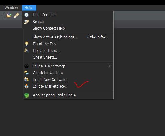 오른쪽 상단에 Help -> Eclipse Marketplace 클릭!